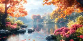 autumn fall stream river forest trees leaves orange red yellow pink coral flowers plants sunlight light glow vibrant colors landscape nature scenic peaceful serene tranquil calm beautiful digital painting art fantasy dreamlike enchanting artwork illustration scenic view autumnal colors forest scene water scene nature photography artistic creative vibrant colors autumn leavesSimilar Photos