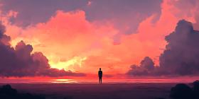 sunset silhouette digital painting peaceful vista landscape nature sky clouds calm tranquil serene shoreline water reflection orange red pink purple colors vibrant dramatic texture solitary figure contemplation beauty art artwork illustration painting digital art artistic creative scene atmospheric intense powerful evocative mood feeling emotion masterpieceSimilar Photos