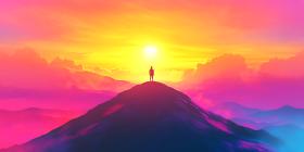 Vibrant Sunset Landscape Person on Mountain Peak at Sunrise