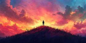 sunset silhouette hill figure person landscape sky clouds vibrant colors orange pink purple blue dramatic beautiful scenic nature peaceful serene solitude vast horizon view panorama artistic digital art artwork illustration fantasy dreamlike magical inspiring hope calm tranquility elevation achievement perspective outlook majestic powerSimilar Photos