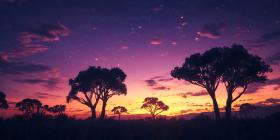 Serene Sunset Landscape Silhouette Trees Under Starry Sky