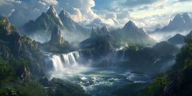 Epic Fantasy Landscape Majestic Mountains and Cascading Waterfal