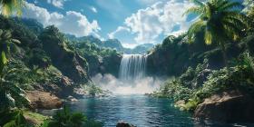 waterfall landscape nature jungle tropical river forest cliffs green lush leaves trees plants sunlight clouds sky scenic view panorama serene peaceful tranquil beauty untouched natural environment ecosystem mist water rocks hills mountains paradise scenic view vibrant amazing breathtaking summer daytime outdoor fresh clean flowingSimilar Photos