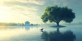 sunrise sunset lake tree reflection water calm peaceful serene tranquil nature landscape digital art painting illustration bird building dome morning dawn sky clouds fog mist island shoreline green lush leaves branches artwork artistic scenic view beautiful pretty aesthetic environment outdoor scene solitude quiet peaceful scene stillnessSimilar Photos