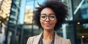 businesswoman professional portrait woman black woman african american curly hair glasses eyewear blazer beige blazer jacket modern urban city building glass building office corporate confident successful headshot closeup smile positive expression professional attire work career powerful leadership entrepreneur executive management business style fashion beauty portrait photography model outdoor cityscapeSimilar Photos