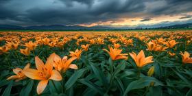 Orange Lily Field Dramatic Sunset Landscape Photography