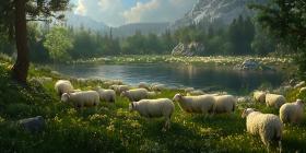 Peaceful Pastoral Scene Sheep Grazing by Serene Mountain River