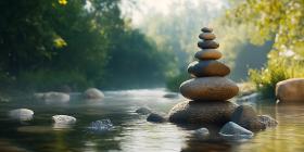 Serene Stacked Stones by Calm Water A Peaceful Nature Scene