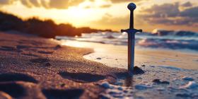 sword beach ocean sunset seascape waves sand weapon metal blade sun golden hour landscape epic fantasy mythology legend powerful serene calm water sky horizon rocks stones shoreline coast nature twilight dramatic light reflection solitude peace mystery adventure journey victory courage battle war artistic photographySimilar Photos