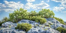 landscape nature scenery plants shrubs bushes rocks stone hillside terrain green foliage vegetation sky clouds blue sky sunlit outdoor environment ecosystem flora botanical serene peaceful scenic view vista panorama summer spring daytime bright colorful vibrant beauty natural untamed wild rocky landscape lush greenery mountain vegetationSimilar Photos