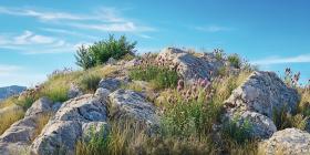 Rocky Hilltop Landscape Summer Meadow Plants and Clear Sky