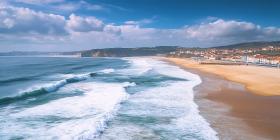 Ocean Waves Crashing on Sandy Beach with Coastal Town