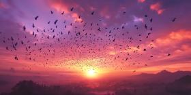 birds sunset sky flock flight silhouette pink purple orange vibrant colors horizon cityscape nature scene panoramic view movement energy peaceful serene beautiful birds in flight sunset sky evening twilight aerial view music notes composition dynamic freedom awe inspiring birds silhouette colorful landscape artistic dramatic breathtaking amazing natural scenicSimilar Photos