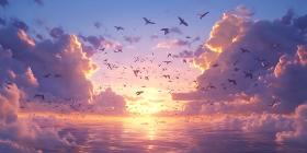 Sunset Sky Birds in Flight Colorful Clouds Scenic Landscape