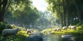 sheep flock forest trees nature peaceful serene tranquil stream water green leaves sunlight light landscape scenery countryside rural pastoral farm animals wildlife meadow grass summer spring daytime idyllic calm quiet beautiful scenic environment ecosystem woodland woods pasture outdoors photography digital art illustrationSimilar Photos