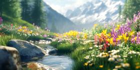 Vibrant Mountain Wildflowers Stream Serene Nature Scene
