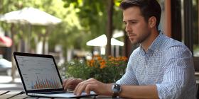man laptop cafe outdoor working businessman professional technology computer concentrated focus work summer trees green urban city lifestyle style shirt watch screen digital notebook desk table communication productive relaxed tranquil pleasant environment young adult person business internet online effort determination casual activitySimilar Photos
