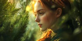 woman redhead girl portrait artistic art illustration painting digital art nature foliage leaves green sunlight golden hour light shadow dreamy ethereal fantasy mystery pensive expression beautiful hair face eyes close-up profile details texture atmosphere scene woman portrait red hair green leaves artistic portrait digital painting natural lightSimilar Photos
