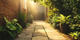 Sunlit Brick Path Serene Garden Alleyway