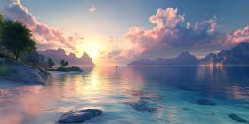 tropical beach sunset ocean paradise island beach sea sky clouds sun horizon water sand rocks trees palm trees tropical landscape nature scenic beautiful view panoramic calm serene peaceful relaxing vacation travel escape holiday dream idyllic amazing stunning breathtaking photorealistic digital art artwork illustration painting colorful vibrant light reflectionSimilar Photos