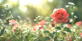 Radiant Red Rose with Dew: A Detailed Close-Up in Dreamy Sunlit Bokeh