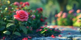 Radiant Red Rose with Dew: A Detailed Close-Up in Dreamy Sunlit Bokeh