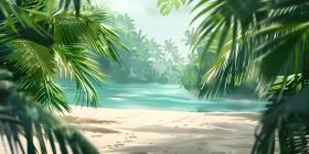 Tropical Beach Paradise: Aerial View of Pristine Turquoise Waters Gently Lapping onto Sandy Shores Framed by Lush Palm Leaves
