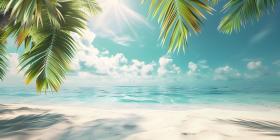 Tropical Beach Paradise: Aerial View of Pristine Turquoise Waters Gently Lapping onto Sandy Shores Framed by Lush Palm Leaves
