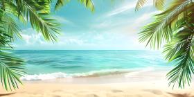 Tropical Beach Paradise: Aerial View of Pristine Turquoise Waters Gently Lapping onto Sandy Shores Framed by Lush Palm Leaves