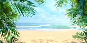 Tropical Beach Paradise: Aerial View of Pristine Turquoise Waters Gently Lapping onto Sandy Shores Framed by Lush Palm Leaves