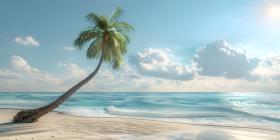 Serene Tropical Beach: A Clear Blue Sky Over a Calm Ocean with Gentle Waves, Sandy Shore, and Tall Palm Tree Extending Over the Beach