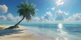 Serene Tropical Beach: A Clear Blue Sky Over a Calm Ocean with Gentle Waves, Sandy Shore, and Tall Palm Tree Extending Over the Beach