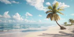 Serene Tropical Beach: A Clear Blue Sky Over a Calm Ocean with Gentle Waves, Sandy Shore, and Tall Palm Tree Extending Over the Beach