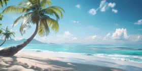 Serene Tropical Beach: A Clear Blue Sky Over a Calm Ocean with Gentle Waves, Sandy Shore, and Tall Palm Tree Extending Over the Beach
