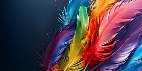 Colorful Feathers: A Striking Display of Pink, Orange, Red, and Blue Against a Solid Blue Background