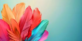 Colorful Feathers: A Striking Display of Pink, Orange, Red, and Blue Against a Solid Blue Background