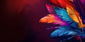 Colorful Feathers: A Striking Display of Pink, Orange, Red, and Blue Against a Solid Blue Background