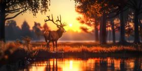 Sunset Serenity: Majestic Deer by the Lakeside Amidst Autumn Foliage and Misty Forest Reflections