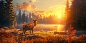 Sunset Serenity: Majestic Deer by the Lakeside Amidst Autumn Foliage and Misty Forest Reflections