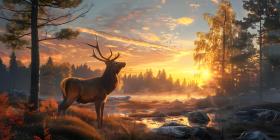 Sunset Serenity: Majestic Deer by the Lakeside Amidst Autumn Foliage and Misty Forest Reflections