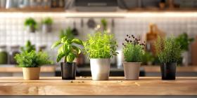 Fresh and Vibrant Kitchen Setting: A Countertop with Potted Herbs, Lemons on a Wooden Cutting Board, and a Glass Jar of Dried Herbs or Spices