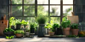 Fresh and Vibrant Kitchen Setting: A Countertop with Potted Herbs, Lemons on a Wooden Cutting Board, and a Glass Jar of Dried Herbs or Spices
