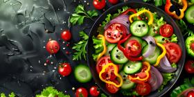 Colorful Salad Explosion: Fresh Vegetables including Tomatoes, Cucumbers, Bell Peppers, and Lettuce with Olives and Onion Slices Floating Over a Bowl