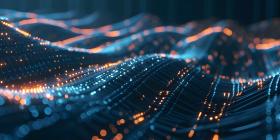Flowing Digital Landscape: An Abstract Representation with Red and Blue Wave-like Structures Composed of Small, Glowing Dots and Lines