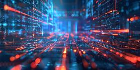 Flowing Digital Landscape: An Abstract Representation with Red and Blue Wave-like Structures Composed of Small, Glowing Dots and Lines