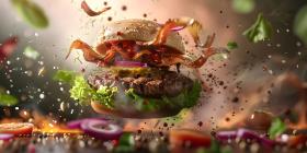 Floating Hamburger with Ingredients in Mid-Air: A Dynamic and Vibrant Presentation Featuring a Sesame Seed Bun, Beef Patty, Lettuce, Tomato, Cheese, and Sauce