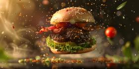 Floating Hamburger with Ingredients in Mid-Air: A Dynamic and Vibrant Presentation Featuring a Sesame Seed Bun, Beef Patty, Lettuce, Tomato, Cheese, and Sauce