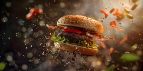 Floating Hamburger with Ingredients in Mid-Air: A Dynamic and Vibrant Presentation Featuring a Sesame Seed Bun, Beef Patty, Lettuce, Tomato, Cheese, and Sauce