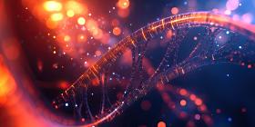 Artistic DNA Double Helix: Glowing Intricate Design with Bright Orange and Red Hues on a Dark Background, Featuring Bokeh Light Effects