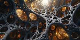 Intricate Network of Web-Like Structures: Metallic or Organic Appearance with Warm Golden Light Backdrop, Creating a Visually Captivating and Abstract Artistic Scene